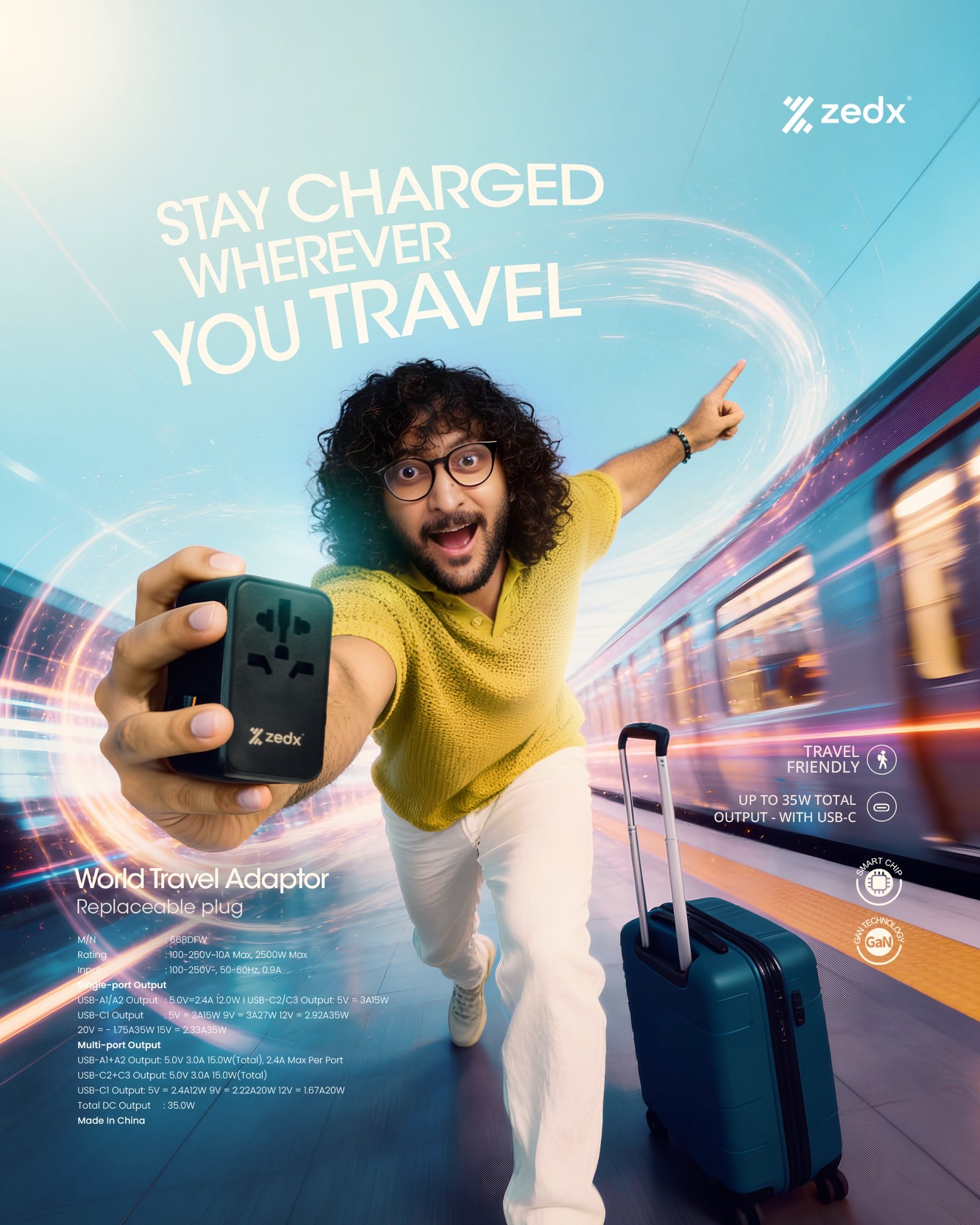 Charge all your devices effortlessly wherever you go with the ZEDX World Travel Adapter. Featuring 3 USB-C ports, 2 USB-A ports, and a universal AC socket, it delivers fast charging for smartphones, tablets, and laptops. Compact, lightweight, and built with GaN technology, it’s the perfect travel companion for over 150 countries, offering reliable power and built-in safety protections.